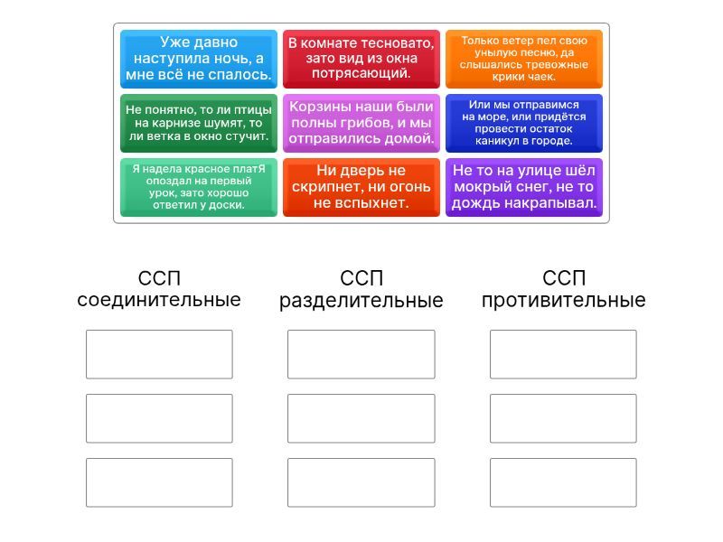 ССП соединительные: Только ветер пел свою унылую песню, да слышались тревожные крики чаек., Ни дверь не скрипнет, ни огонь не вспыхнет., Корзины наши были полны грибов, и мы отправились домой., ССП разделительные: Или мы отправимся на море, или придётся провести остаток каникул в городе., Не то на улице шёл мокрый снег, не то дождь накрапывал., Не понятно, то ли птицы на карнизе шумят, то ли ветка в окно стучит., ССП противительные: Уже давно наступила ночь, а мне всё не спалось., В комнате тесновато, зато вид из окна потрясающий., Я надела красное платЯ опоздал на первый урок, зато хорошо ответил у доски.,