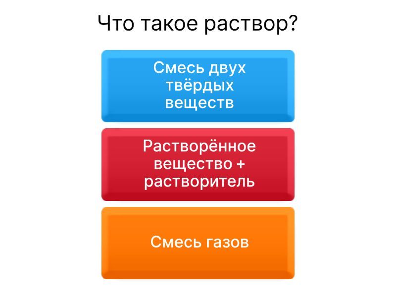 1) Что такое раствор? a) Смесь двух твёрдых веществ b) Растворённое вещество + растворитель c) Смесь газов 2) Растворённое вещество — это… a) Вещество, которое растворяется в воде b) Вещество, ускоряющее растворение c) Вещество, которое нельзя растворять 3) Самый распространённый вид растворителя? a) Сахар b) вода 4) Что такое насыщенный раствор? a) Раствор с малым количеством вещества b) Раствор, в котором растворён максимум вещества c) Бесцветный раствор 5) Если к 100 г воды добавить 20 г соли, что получится? a) Смесь соли b) Раствор соли c) Гетерогенная смесь 6) Что показывает концентрация раствора? a) Массу растворителя b) Количество растворённого вещества c) Температуру раствора 7) Что выбирают в первую очередь при приготовлении раствора? a) Растворённое вещество b) Растворитель c) Тип ёмкости 8) Почему соль полностью растворяется в воде? a) Потому что соль лёгкая b) Потому что вода — универсальный растворитель c) Потому что соль тёплая 9) Что можно сделать, чтобы сахар быстрее растворился в воде? a) Охладить воду b) Перемешивать и подогреть c) Добавить сахар крупным куском 10) Что нужно для получения 5% раствора? a) 5 г растворённого вещества + 95 г растворителя b) 50 г вещества + 50 г воды c) 10 г вещества + 90 г воды
