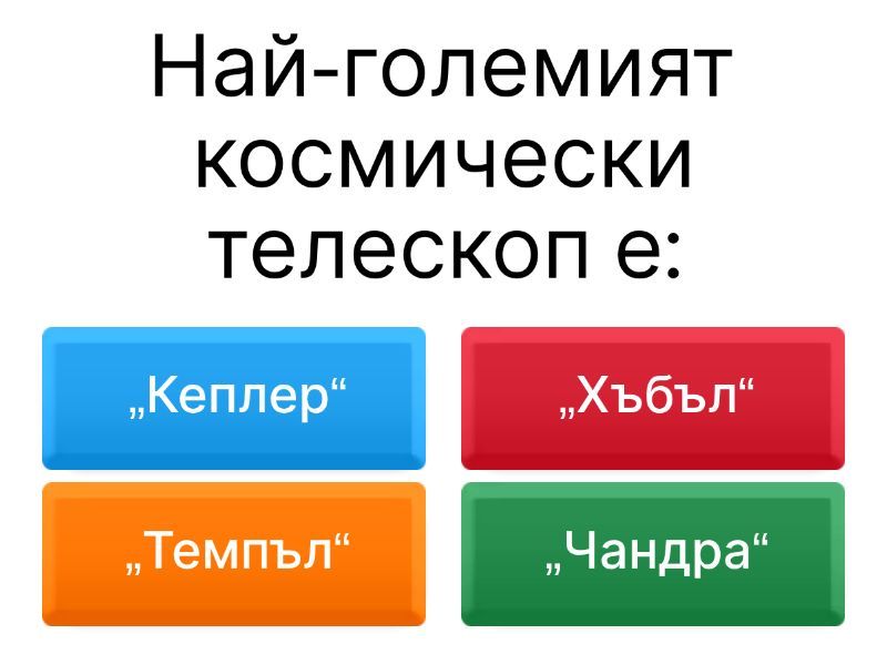 1) Най-големият космически телескоп е: a) „Кеплер“ b) „Хъбъл“ c) „Темпъл“ d) „Чандра“ 2) Космическите сонди служат: a) за пребиваването на хора в космическото пространство b) за предаване на телефонни разговори и съобщения по интернет c) за извличане на твърди горива от чужди планети d) за изследване на далечни планети от Слънчевата система и изпращане на получената информация на Земята 3) През 1969 година за първи път хора стъпват на Луната. a) ВЯРНО b) ГРЕШНО 4) Посочи грешното твърдение. a) Изкуствените спътници служат за наблюдение на Земята и Космоса. b) Изкуствените спътници събират данни за движението на въздуха и облаците. c) Изкуствените спътници служат за наблюдение на близки обекти с малки размери. d) Изкуствените спътници участват в предаването на радио и телевизионни сигнали. 5) Първият космически апарат (Спутник 1) е изведен в орбита през: a) 2000 ГОДИНА b) 2017 ГОДИНА c) 1957 ГОДИНА d) 1857 ГОДИНА 6) Изкуствена конструкция, създадена с цел пребиваването на хора в космическото пространство, се нарича: a) ракета носител b) марсоход c) орбитална станция d) естествен спътник 7) Кое от изброените събития се случва през 2015 година? a) Космическата сонда "Касини" достига планетата Сатурн. b) Космическата сонда "Нови хоризонти" достига отвъд орбитата на Плутон. c) Извършва се първият полет на човек в Космоса – Юрий Гагарин. d) Извършва се първият полет на животно в Космоса – кучето Лайка. 8) Орбиталните космически станции НЕ се използват за: a) изследване на Земята и Космоса b) извеждане на отпадъци и вредни вещества в космическото пространство c) провеждане на експерименти, отглеждане на растения и получаване на нови материали d) проследяване и изследване на жизнените процеси при различни организми по време на полет в Космоса