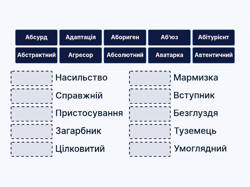 Абітурієнт - Вступник, Абориген - Туземець, Абсолютний - Цілковитий, Абстрактний - Умоглядний, Абсурд - Безглуздя, Аб’юз - Насильство, Аватарка - Мармизка, Автентичний - Справжній, Агресор - Загарбник, Адаптація - Пристосування,