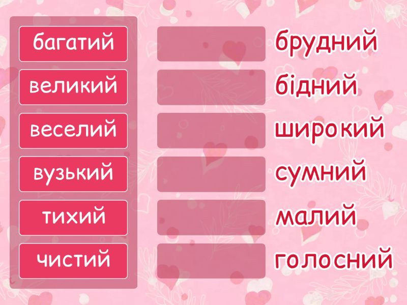 великий - малий, чистий - брудний, веселий - сумний, тихий - голосний, вузький - широкий, багатий - бідний,