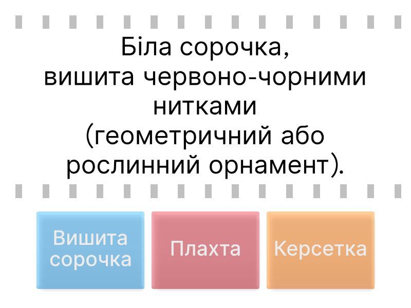 Вишита сорочка - Біла сорочка, вишита червоно-чорними нитками (геометричний або рослинний орнамент)., Плахта - Довга спідниця у клітинку, Керсетка - Жіноча безрукавка, прикрашена вишивкою або тасьмою.,