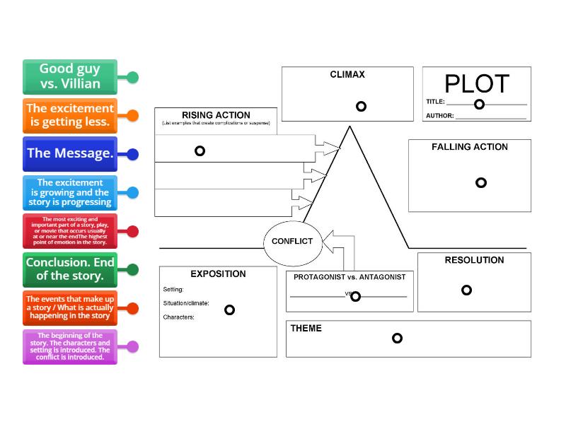 The excitement is growing and the story is progressing, The most exciting and important part of a story, play, or movie that occurs usually at or near the endThe highest point of emotion in the story., The excitement is getting less., Conclusion. End of the story. , The beginning of the story. The characters and setting is introduced. The conflict is introduced., The Message., Good guy vs. Villian, The events that make up a story / What is actually happening in the story.