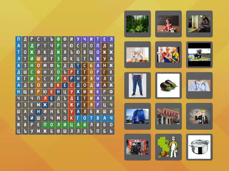 фризьор, учител, лекар, готвач, строител, инженер, шофьор, полицай, пожарникар, суджук, патладжан, джунгла, тенджера, бояджия, джинси,