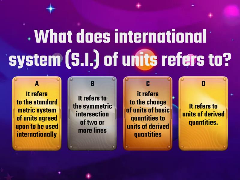 1) What does international system (S.I.) of units refers to? a) It refers to the standard metric system of units agreed upon to be used internationally b) It refers to the symmetric intersection of two or more lines c) it refers to the change of units of basic quantities to units of derived quantities d) It refers to units of derived quantities. 2) A base S.I. - unit is... a) the set of units in the metric system of measurement that is based on derived quantities b) the standard for expressing the measurement of a base quantity within the international system of units. c) the unit of mass only d) the units that have been agreed upon by the international community 3) Which one of the following correctly states the base S.I. unit of temperature? a) Degrees Celsius  b) Degrees Fahrenheit c) Degrees Rankine d) Kelvin 4) ....... is a set of base S.I. - units a) Kilogram, gram, kelvin, mole and minute b) Pascal, ampere, candella, meter and second c) Kilogram, kelvin, mole, second and candella d) Candella, Newton, tonne, square meter and rankine 5) the physical quantity for which the base SI unit is candella is called a) lux b) lumen c) luminous intensity d) Debye 6) Express a Newton as a function of base units. a) Kg.m/ s2 b) Kg.a c) Kg/ s2 d) Kg.m/s 7) Which of the following best explains why the kelvin is the SI unit of temperature? a) The kelvin was the first unit of temperature to be devised. b) A change of 1 kelvin is smaller than a change of 1 degree Celsius. c) A change 0.1 kelvin produces a larger value of degree rankine d) A temperature of zero kelvins is the minimum possible temperature. 8) The symbol for kilojoule as an unit of energy is a) Kl b) Kj c) Kg d) Ko 9) Which of the following SI units is defined by reference to the properties of a unique, standard object held at the International Bureau of Weights and Measures? a) The meter b) The kilogram c) The steradian d) The mole 10) The physical quantity that has the SI unit mole is identified as..... a) radiant intensity b) luminous flux c) luminous intensity d) amount of a substance