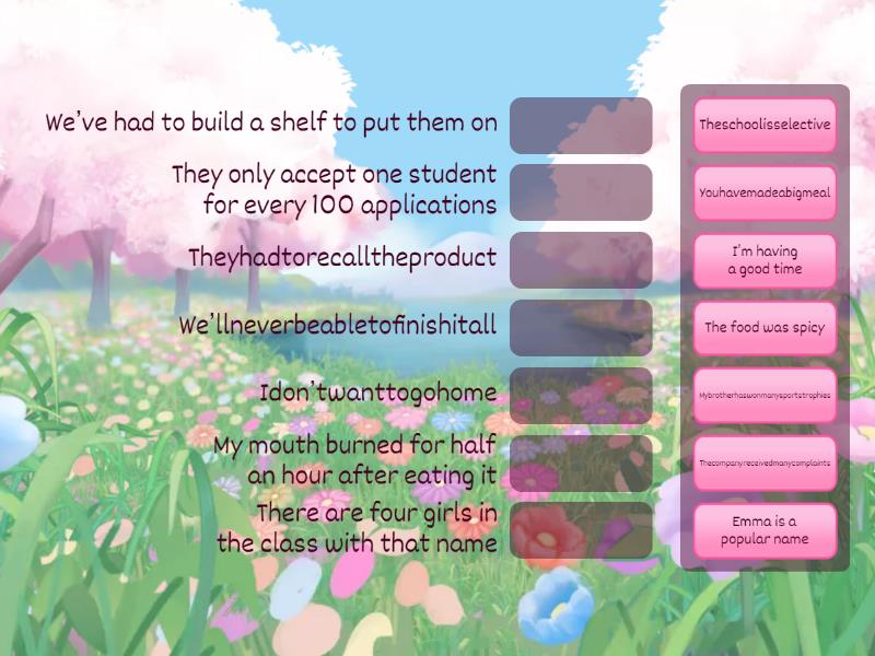 I’m having a good time - Idon’twanttogohome, The food was spicy - My mouth burned for half an hour after eating it, Emma is a popular name - There are four girls in the class with that name, Theschoolisselective - They only accept one student for every 100 applications, Thecompanyreceivedmanycomplaints - Theyhadtorecalltheproduct, Mybrotherhaswonmanysportstrophies - We’ve had to build a shelf to put them on, Youhavemadeabigmeal - We’llneverbeabletofinishitall,