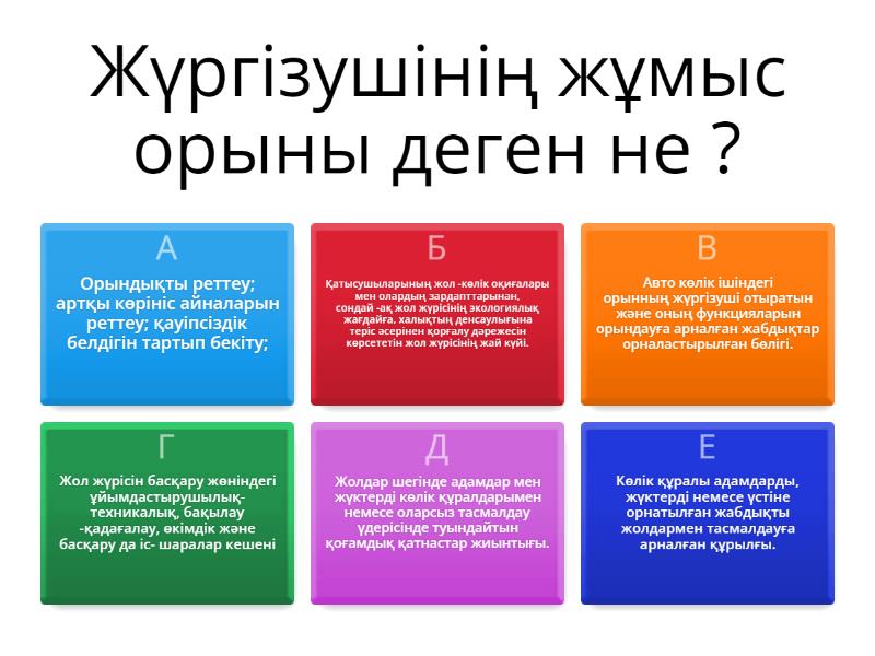 1) Жүргізушінің жұмыс орыны деген не ? a) Орындықты реттеу; артқы көрініс айналарын реттеу; қауіпсіздік белдігін тартып бекіту; b) Қатысушыларының жол -көлік оқиғалары мен олардың зардапттарынан, сондай -ақ жол жүрісінің экологиялық жағдайға, халықтың денсаулығына теріс әсерінен қорғалу дәрежесін көрсететін жол жүрісінің жай күйі. c) Авто көлік ішіндегі орынның жүргізуші отыратын және оның функцияларын орындауға арналған жабдықтар орналастырылған бөлігі. d) Жол жүрісін басқару жөніндегі ұйымдастырушылық- техникалық, бақылау -қадағалау, өкімдік және басқару да іс- шаралар кешені e) Жолдар шегінде адамдар мен жүктерді көлік құралдарымен немесе оларсыз тасмалдау үдерісінде туындайтын қоғамдық қатнастар жиынтығы. f) Көлік құралы адамдарды, жүктерді немесе үстіне орнатылған жабдықты жолдармен тасмалдауға арналған құрылғы. 2) Жүргізуші көлік жүргізуді бастамас бұрын, қандай әрекеттерді орындауға міндетті. a) Қатысушыларының жол -көлік оқиғалары мен олардың зардапттарынан, сондай -ақ жол жүрісінің экологиялық жағдайға, халықтың денсаулығына теріс әсерінен қорғалу дәрежесін көрсететін жол жүрісінің жай күйі. b) Жолдар шегінде адамдар мен жүктерді көлік құралдарымен немесе оларсыз тасмалдау үдерісінде туындайтын қоғамдық қатнастар жиынтығы. c) Жол жүрісін басқару жөніндегі ұйымдастырушылық- техникалық, бақылау -қадағалау, өкімдік және басқару да іс- шаралар кешені. d) Орындықты реттеу; артқы көрініс айналарын реттеу; қауіпсіздік белдігін тартып бекіту; e) Көлік құралы адамдарды, жүктерді немесе үстіне орнатылған жабдықты жолдармен тасмалдауға арналған құрылғы. f) Авто көлік ішіндегі орынның жүргізуші отыратын және оның функцияларын орындауға арналған жабдықтар орналастырылған бөлігі. 3) Жол жүрісі дегеніміз не? a) Жолдар шегінде адамдар мен жүктерді көлік құралдарымен немесе оларсыз тасмалдау үдерісінде туындайтын қоғамдық қатнастар жиынтығы. b) Қатысушыларының жол -көлік оқиғалары мен олардың зардапттарынан, сондай -ақ жол жүрісінің экологиялық жағдайға, халықтың денсаулығына теріс әсерінен қорғалу дәрежесін көрсететін жол жүрісінің жай күйі. c) Көлік құралы адамдарды, жүктерді немесе үстіне орнатылған жабдықты жолдармен тасмалдауға арналған құрылғы. d) Орындықты реттеу; артқы көрініс айналарын реттеу; қауіпсіздік белдігін тартып бекіту; e) Жол жүрісін басқару жөніндегі ұйымдастырушылық- техникалық, бақылау -қадағалау, өкімдік және басқару да іс- шаралар кешені. f) Авто көлік ішіндегі орынның жүргізуші отыратын және оның функцияларын орындауға арналған жабдықтар орналастырылған бөлігі. 4) Жол жүрісінің қауіпсіздігі дегеніміз не? a) Көлік құралы адамдарды, жүктерді немесе үстіне орнатылған жабдықты жолдармен тасмалдауға арналған құрылғы. b) Жолдар шегінде адамдар мен жүктерді көлік құралдарымен немесе оларсыз тасмалдау үдерісінде туындайтын қоғамдық қатнастар жиынтығы. c) Авто көлік ішіндегі орынның жүргізуші отыратын және оның функцияларын орындауға арналған жабдықтар орналастырылған бөлігі. d) Жол жүрісін басқару жөніндегі ұйымдастырушылық- техникалық, бақылау -қадағалау, өкімдік және басқару да іс- шаралар кешені. e) Орындықты реттеу; артқы көрініс айналарын реттеу; қауіпсіздік белдігін тартып бекіту; f) Қатысушыларының жол -көлік оқиғалары мен олардың зардапттарынан, сондай -ақ жол жүрісінің экологиялық жағдайғ