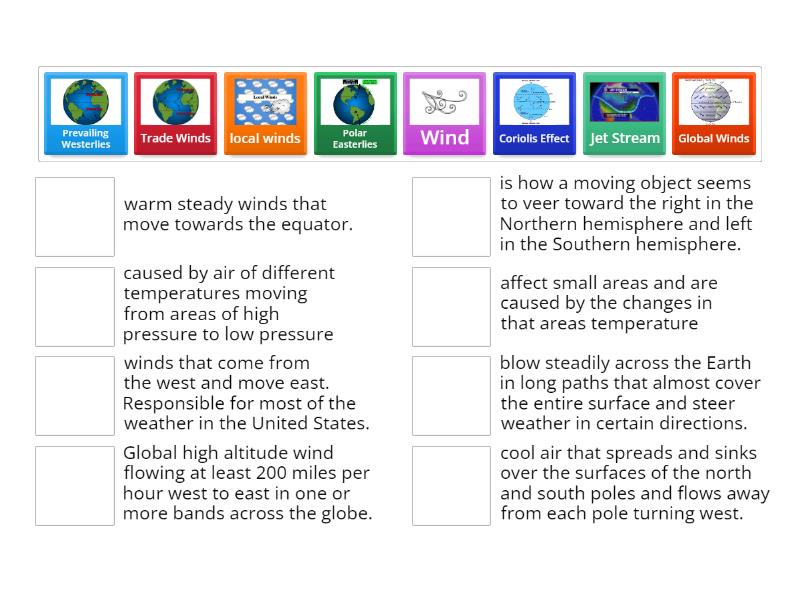Coriolis Effect - is how a moving object seems to veer toward the right in the Northern hemisphere and left in the Southern hemisphere., Global Winds - blow steadily across the Earth in long paths that almost cover the entire surface and steer weather in certain directions., Trade Winds - warm steady winds that move towards the equator., Prevailing Westerlies - winds that come from the west and move east. Responsible for most of the weather in the United States., Polar Easterlies - cool air that spreads and sinks over the surfaces of the north and south poles and flows away from each pole turning west., Jet Stream - Global high altitude wind flowing at least 200 miles per hour west to east in one or more bands across the globe., Wind - caused by air of different temperatures moving from areas of high pressure to low pressure, local winds - affect small areas and are caused by the changes in that areas temperature,