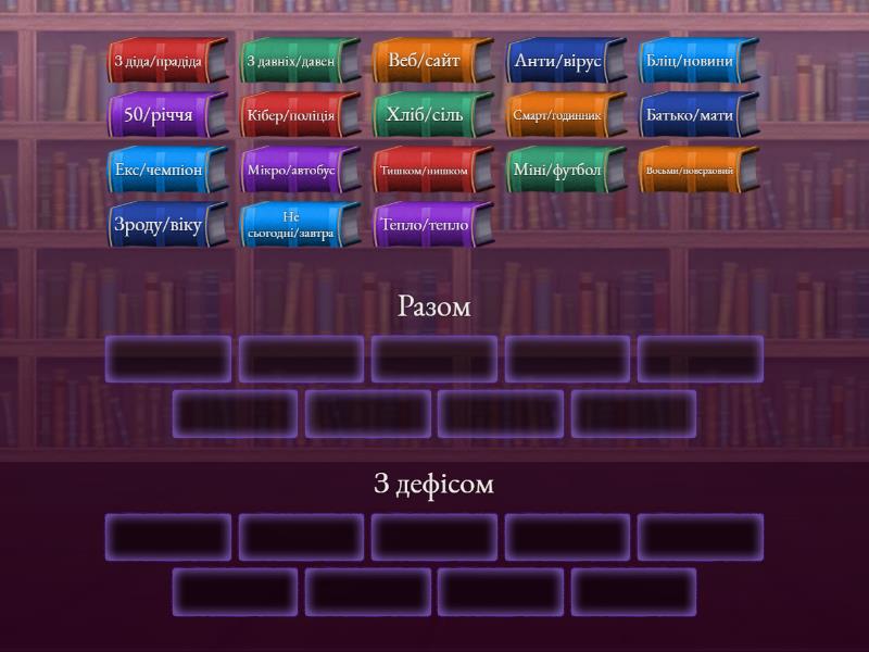 Разом: Мікро/автобус, Екс/чемпіон, Кібер/поліція, Смарт/годинник, Веб/сайт, Анти/вірус, Восьми/поверховий, Міні/футбол, Бліц/новини, З дефісом: 50/річчя, Хліб/сіль, Зроду/віку, З давніх/давен, Не сьогодні/завтра, Тепло/тепло, Батько/мати, З діда/прадіда, Тишком/нишком,