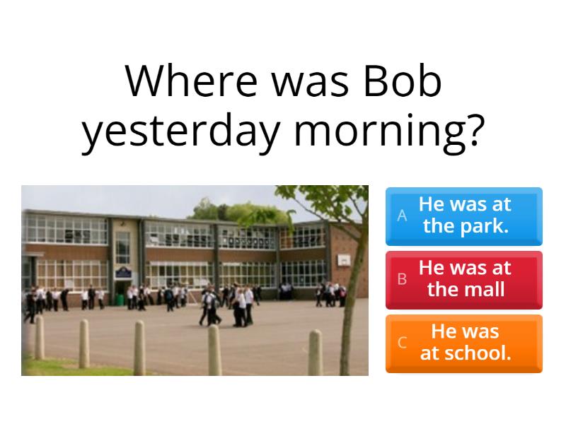 1) Where was Bob yesterday morning? a) He was at the park. b) He was at the mall c) He was at school. 2) How was it? a) It was interesting. b) It was boring. c) It was scary. 3) Where was Bob yesterday afternoon? a) He was at the amusement park. b) He was at the bookshop. c) He was at home. 4) Who was with him? a) His teachers. b) His brother. c) His friends. 5) Where was he yesterday evening? a) He was at the mall. b) He was at the playground. c) He was at home.