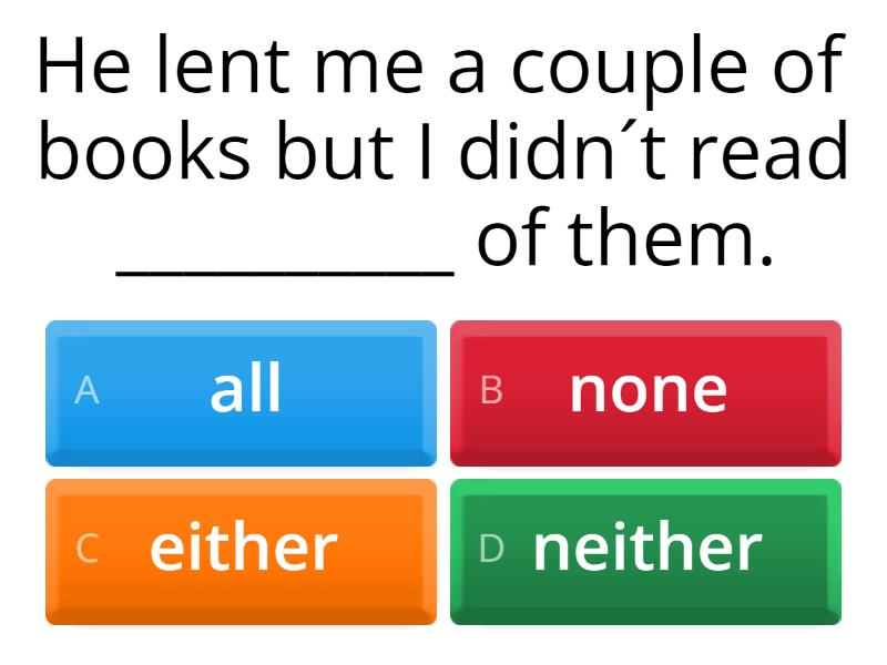 1) He lent me a couple of books but I didn´t read __________ of them. a) all b) none c) either d) neither 2) There are a few shops in my town, but ________ of them sell food. a) none b) all c) neither d) either e) both 3) ___________ Peter and John came to the party, even though I didn´t invite either of them. a) Neither b) Either c) None d) Both 4) ______ fish live in water. a) none b) both c) either d) neither e) all 5) Nazli has two children. ____________ are married. a) Both b) All c) None d) Either e) Neither 6) _______ Sohailah and Raghad are smart. a) Neither b) Both c) Either d) All e) None f) Not only 7) I don't play ________ football or cricket. a) neither b) both c) either d) all e) none f) not only 8) I play ________ football nor cricket. a) neither b) both c) either d) all e) none f) not only 9) He’s both tall ______ handsome. a) and b) or c) nor d) but also 10) I’m ______ happy and confused at the same time! a) both b) or c) nor d) not only e) neither f) either 11) Neither John ______ Fred likes doing the dishes. a) and b) or c) not only d) but also e) nor 12) They’ll be here either on Monday _______ on Tuesday. a) and b) or c) not only d) but also e) nor 13) ____________Carla or her sisters is/are going to be there at your arrival.  a) Either b) Or c) Not only d) but also e) Neither f) Both 14) That tennis game was very close. ___________ player had a clear advantage. a) All b) None c) Both d) Either e) Neither 15) _______ parent knew about the accident. a) All b) None c) Both d) Not only e) Neither 16) _________ our cars has enough petrol so we have to take the bus. a) All b) All of c) Both d) Neither e) Neither of f) Both of 17) Neither of them_______ married. a) is b) are c) were d) have been 18) I have _______ time nor money. a) either b) both c) neither d) all e) none f) not only 19) I don’t have __________ time or money. a) either b) both c) neither d) all e) none f) not only 20) Either you or John _______to finish the report before 5pm. a) have b) has c) want d) are willing e) don't have 21) ____________them passed the exam. a) Neither b) Both of c) Both d) Either e) None f) All 22) Either candidate ____________ a good option. a) are b) were c) have been d) is e) occupy f) offer 23) Neither candidate ____________ a good option. a) are b) were c) have been d) is e) occupy f) offer 24) I don’t have ________ the patience nor the time to wait here all morning. a) either b) both c) all d) neither e) none f) not only 25) ‘How many friends do you have?’ ‘___________.’ a) Both b) All c) Neither d) Either e) Not only f) None 26) Raghad has got three cats. They are_______white with green eyes. a) both b) all c) none d) either e) neiter 27) All of my friends have already made plans, so_____of them can hang out with me. a) both b) all c) none d) either e) neiter 28) A: Which pair of shoes would you choose? B: _______. They’re ________awful. a) Neither/ both b) Both/ neither c) Bothe/ either d) All/ neither e) Both/ none f) Either/ neither 29) _______Angela and Edna had the soup of the day, but _______ of them liked it. a) All………either b) All……..neither c) Both……either d) Both……neither e) Not only.....also 30) We’ve got two coffee machines but ____of them works properly. We need to buy a new one. a) both b) all c) neither d) none e) either 31) I watched two films this weekend. I didn’t like _________of them though. a) either b) neitehr c) both d) all e) none 32) _________ Abedul Wareth and I want to go out, but _____of us has got money, so, we’re staying at home. a) Neither/ both b) Either/ neither c) Both/ either d) Both/ neither e) All/ none f) Both/ none 33) There were over ten boys, and __________ them were eating sunflower seeds. They loved them. a) all b) none of c) both of d) neither of e) either of f) all of 34) They showed me five strings of pearls, but I didn't like __________ them. a) both b) either c) neither d) none e) all 35) ________ of the supermarkets was open. a) All b) Both c) Neither 36) I'll take _________ three shirts, please. a) all b) none c) both d) either e) neither f) not only 37) _________ us can come tomorrow a) All b) None c) Both d) Either e) Neither f) All of 38) All children __________ love. a) needs b) need c) has asked for d) is waiting for 39) _____________ my parents are dead. a) All of b) None c) Either of d) Neither of e) Both of f) Neither 40) Come on Sunday or Monday. Either day _______ OK. a) is b) are c) seem 41) A: 'Would you like tea or coffee?'  B: 'I don't mind. ______.' a) All b) None c) Neither d) Either 42) I don't speak _______ French or German. a) neither b) all c) none d) either e) not only 43) A: Can you come on Monday or Tuesday? B: I'm afraid __________ day is possible. a) all b) none c) both d) either e) neither 44) The film was neither well made _____ well acted. a) or b) and c) nor d) but also 45) We go there not only in winter, __________ in summer. a) and b) or c) nor d) but also 46) She not _______ plays the piano, but also the violin. a) only b) either c) neither d) or 47) Unfortunately, ________ of the cures works. a) all b) both c) none d) either
