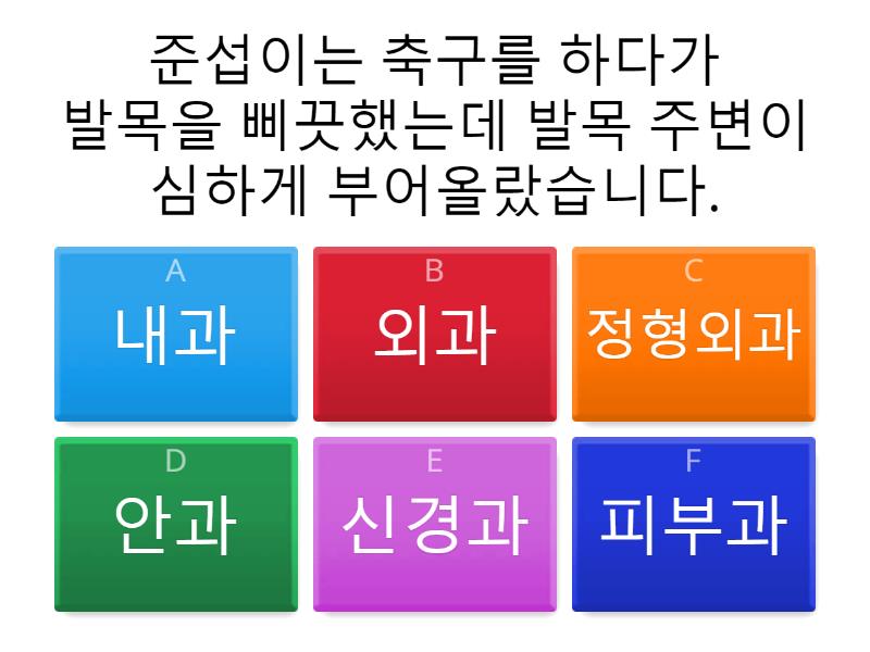 1) 준섭이는 축구를 하다가 발목을 삐끗했는데 발목 주변이 심하게 부어올랐습니다. a) 내과 b) 외과 c) 정형외과 d) 안과 e) 신경과 f) 피부과 2) 초등학생인 민수는 며칠 전부터 감기에 걸렸습니다 a) 외과 b) 정신의학과 c) 비뇨기과 d) 정형외과 e) 소아 청소년과 f) 산부인과 3) 희철이는 스트레스가 너무 심해서 잠을 잘 수도 없고, 자꾸 눈물이 납니다. a) 외과 b) 정신 건강 의학과 c) 신경외과 d) 내과 e) 소아 청소년과 f) 이비인후과 4) 도영이 아버지가 점심 식사 후 체한 것 같다고 하십니다. a) 내과 b) 외과 c) 소아 청소년과 d) 정신 건강 의학과 e) 비뇨기과 f) 이비인후과 5) 예슬이는 넘어지면서 머리가 땅에 부딪혀 잠깐 정신을 잃었습니다. a) 비뇨기과 b) 산부인과 c) 안과 d) 신경외과 e) 내과 f) 피부과 6) 현빈이는 오늘 아침에 일어나니 눈이 빨갛고, 눈곱이 많이 끼어 있었습니다. a) 소아 청소년과 b) 정형외과 c) 내과 d) 이비인후과 e) 피부과 f) 안과 7) 지호는 축구공에 고환을 맞았는데 통증이 너무 심합니다. a) 외과 b) 내과 c) 비뇨기과 d) 산부인과 e) 이비인후과 f) 정형외과 8) 지영이는 중이염에 걸려 귀가 너무 아픕니다. a) 외과 b) 내과 c) 소아청소년과 d) 이비인후과 e) 피부과 f) 치과 9) 정수는 여드름이 심합니다. a) 외과 b) 내과 c) 소아청소년과 d) 이비인후과 e) 피부과 f) 안과 10) 아영이는 월경을 시작했는데 배통증이 심합니다. a) 외과 b) 내과 c) 비뇨기과 d) 산부인과 e) 치과 f) 정형외과 11) 민지는 급성 충수염에 때문에 수술을 했어요 a) 외과 b) 내과 c) 소아청소년과 d) 이비인후과 e) 비뇨기과 f) 정형외과 12) 윤기는 치아가 너무 아픕니다. a) 내과 b) 치과 c) 외과 d) 이비인후과 e) 정형외과 f) 소아청소년과