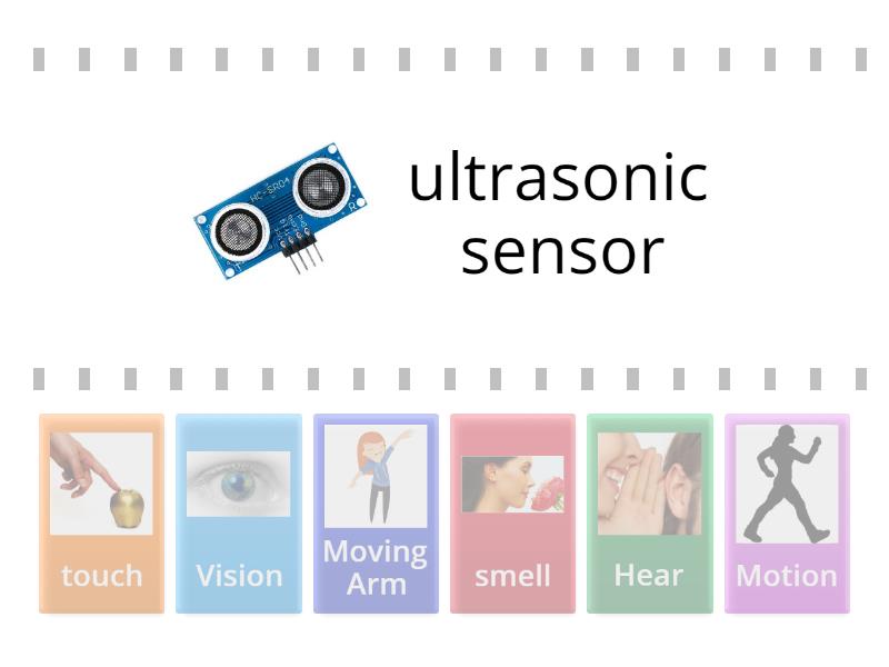 Vision  - ultrasonic sensor, smell - gas sensor , touch - touch sensor, Hear - mic, Motion - motors, Moving Arm - Servo motor,