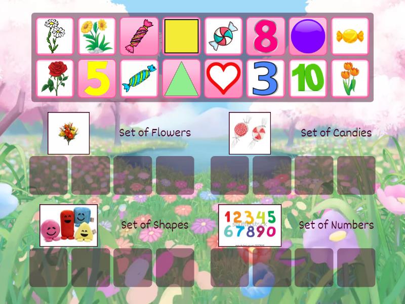 Set of Flowers: , , , , Set of Candies: , , , , Set of Shapes: , , , , Set of Numbers: , , , ,