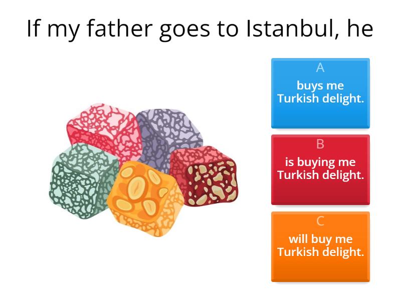 1) If my father goes to Istanbul, he a) buys me Turkish delight. b) is buying me Turkish delight. c) will buy me Turkish delight. 2) If I need your help, a) call you. b) I will call you. c) called you. 3) If you stay awake all night, you will ...................................... tomorrow. a) be very energetic b) be exhausted. c) be very successful 4) If Khawla doesn't hurry, she a) will miss the bus. b) will missed the bus. c) missing the bus. 5) If my father catches some fish, a) we will have some tea. b) we will have a barbecue. c) we didn't eat. 6) If our PE teacher gives us permission, a) we will play basketball. b) we play basketball. c) we played basketball. 7) If I ever meet my favourite tennis player, a) I asked her for an autograph. b) I will ask her for an autograph. c) I am asking her for an autograph.