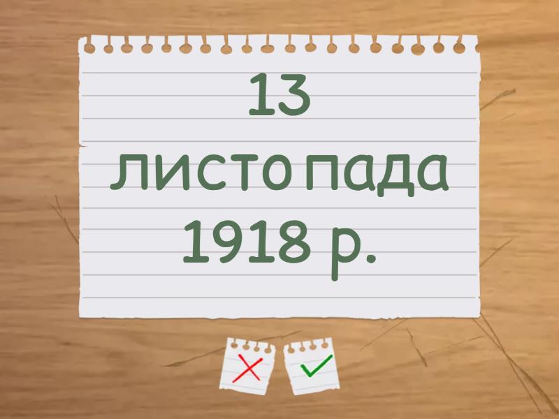 29 квітня 1918 р. - держаний переворот і прихід до влади Павла Скоропадського, 1 листопада 1918 р. - Листопадовий зрив у Львові, 13 листопада 1918 р. - проголошення Західноукраїнської Народної Республіки, Листопад 1918 р. - заснування Української академії наук (УАН), 14 листопада 1918 р. - утворення Директорії, 22 січня 1919 р. - проголошення Акта Злуки УНР та ЗУНР, Грудень 1919 – травень 1920 рр. - Перший «Зимовий похід» Армії УНР, Квітень 1920 р. - Варшавська угода, Березень 1921 р. - Ризький мирний договір, Листопад 1921 р. - Другий «Зимовий похід» Армії УНР, 1921 р. - утворення Української автокефальної православної церкви (УАПЦ),