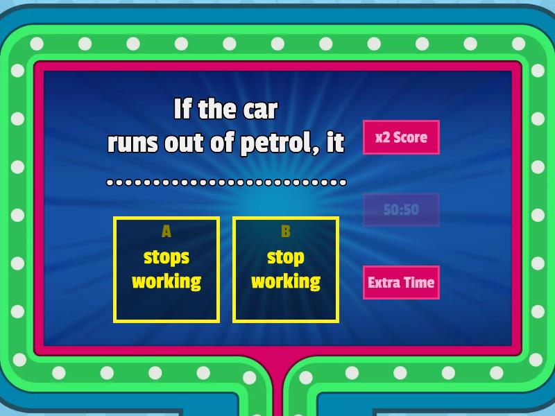 1) If the car runs out of petrol, it .......................... a) stops working b) stop working 2) If there is a big electrical storm, we ............................................... a) not play football outside b) will not play football outside 3) If you miss the bus, you ..................... a) will be late for school b) be late for school 4) If you feel tired , ........................................ a) goes to bed early b) go to bed early. 5) If you touch the dog while it is eating, it .......................... a) will bite you b) be bite you