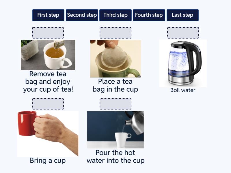 First step - Boil water, Second step - Bring a cup , Third step - Place a tea bag in the cup, Fourth step - Pour the hot water into the cup , Last step - Remove tea bag and enjoy your cup of tea!,