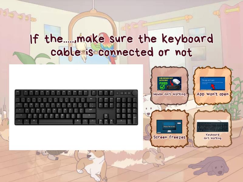 1) If the.....,make sure the keyboard cable is connected or not a) Mouse isn't working b) App won't open c) Screen freezes d) Keyboard isn't working 2) To find a file on your computer, you need to..... a) Shutdown your computer b) Use the search box c) Press Del + Alt d) replace the mouse 3) The......Is from the ICT devices. a) Mobile b) Laptop c) both (a) and (b) d) hand bike 4) Press and hold the "Ctrl" +"Alt" + "Del" buttons when a) The screen freezes b) An app won't open you can't find a file  c) you can't find a file  d) The keyboard isn't working