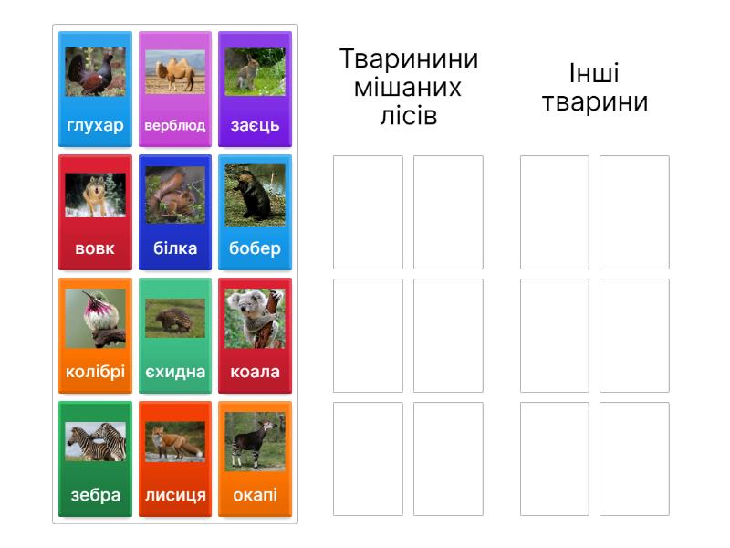 Тваринини мішаних лісів: бобер, білка, вовк, лисиця, глухар, заєць, Інші тварини: зебра, верблюд, коала, єхидна, окапі, колібрі,