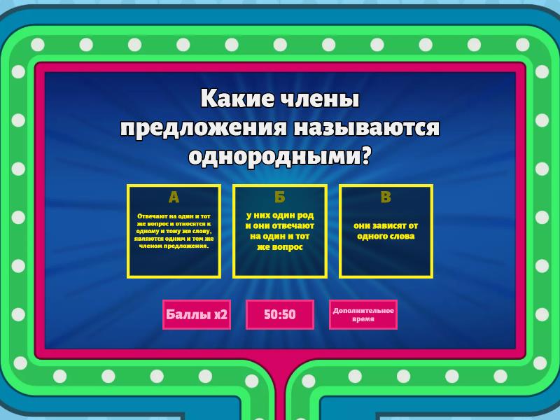1) Какие члены предложения называются однородными? a) Отвечают на один и тот же вопрос и относятся к одному и тому же слову, являются одним и тем же членом предложения. b) у них один род и они отвечают на один и тот же вопрос c) они зависят от одного слова 2) Маша рыхлит землю, поливает цветы и протирает окно. a) предложение без однородных членов b) предложение с однородными членами c) предложение с основой слова 3) Как произносятся однородные члены? a) С интонацией перечисления b) С быстрым темпом речи 4) Катя купила мороженное. a) в предложении есть однородные члены b) в предложении нет однородных членов