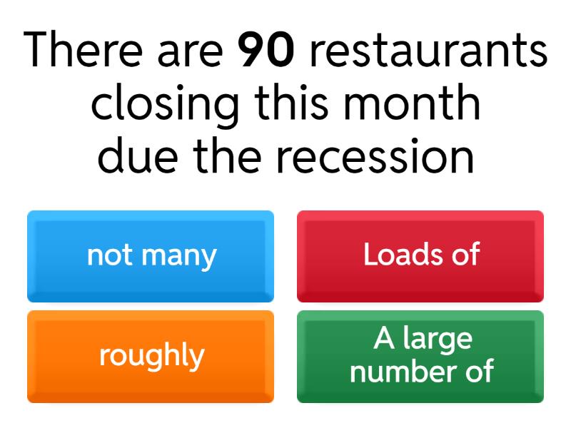 1) There are 90 restaurants closing this month due the recession a) not many b) Loads of c) roughly d) A large number of 2) 6 hospitals are facing closure in our city a) Hundreds of b) loads of c) A number of 3) 510 libraries are threatened with closure across country a) dozens of b) Hundreds of c) up to a hundred 4) The number of cars being sold is down by 19.8% a) nearly 20% b) 20% c) Just over 20% 5) We have to make $3.5 million if we want to survive this crisis a) upwards of $3 b) Over $3.5 c) nearly $3 6) The cost of the supplies has increased 82.5% a) just under 80% b) Upwards of 80% c) Just over 80% 7) The council needs to make $1.2 million usd of cuts in public spending a) About / approximately / just over $1m b) Just under / nearly $1 c) An incredible number of 8) More than 300,000 people have signed the petition to save the rivers a) Hundreds of b) An incredible number of c) Upwards of 299.000 d) A vast number of 9) The city grew a lot economically from 1997 to 2019 a) in the last years b) In the last twenty years or so / thereabouts c) Something like in 22 years