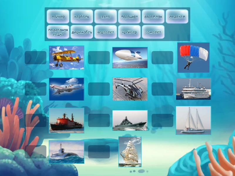 самолёт, корбаль, вертолёт, парашют, ледокол, яхта, подводная лодка, лайнер, дирижабль , аэроплан, крейсер,