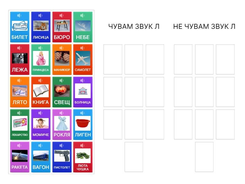 ЧУВАМ ЗВУК Л: ЛЕКАРСТВО, ЛИСИЦА, ЛЕЖА, ЛИГЕН, ЛЮТА ЧУШКА, ЛЯТО, САМОЛЕТ, ПИСТОЛЕТ, БОЛНИЦА, БИЛЕТ, НЕ ЧУВАМ ЗВУК Л: ВАГОН, НЕБЕ, БЮРО, РАКЕТА, СВЕЩ, КНИГА, РОКЛЯ, ПРИНЦЕСА, МАНИКЮР, МОМИЧЕ,