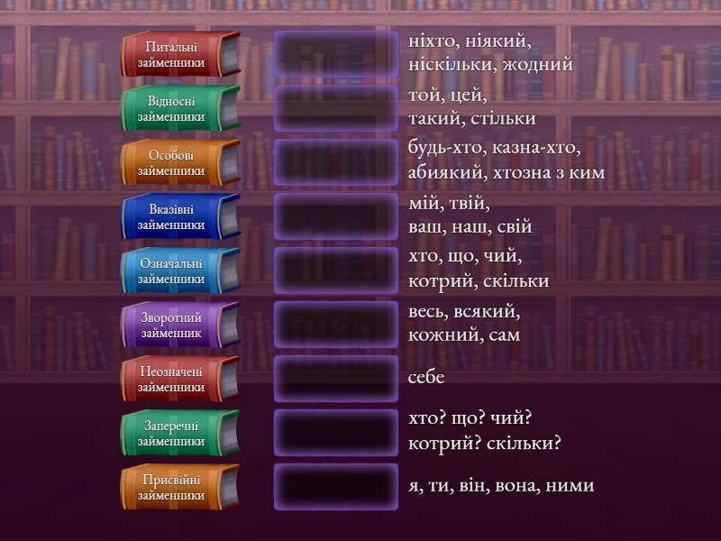 Особові займенники - я, ти, він, вона, ними, Зворотний займенник - себе, Питальні займенники - хто? що? чий? котрий? скільки?, Відносні займенники - хто, що, чий, котрий, скільки, Неозначені займенники - будь-хто, казна-хто, абиякий, хтозна з ким, Заперечні займенники - ніхто, ніякий, ніскільки, жодний, Присвійні займенники - мій, твій, ваш, наш, свій, Вказівні займенники - той, цей, такий, стільки, Означальні займенники - весь, всякий, кожний, сам,