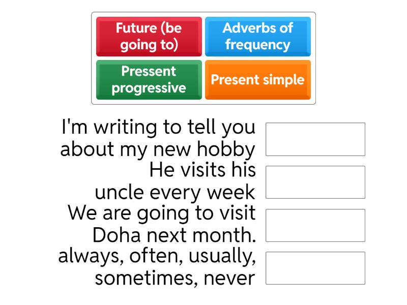 Present simple - He visits his uncle every week, Adverbs of frequency - always, often, usually, sometimes, never, Pressent progressive - I'm writing to tell you about my new hobby, Future (be going to) - We are going to visit Doha next month.,