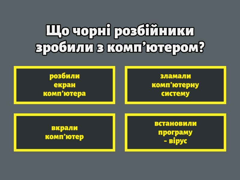 1) Що чорні розбійники зробили з комп'ютером? a) розбили екран комп'ютера b) зламали комп'ютерну систему c) вкрали комп'ютер d) встановили програму - вірус 2) Що помітила Зима надворі? a) плачуть бурульки, сіріє сніг, тремтять на вітрі голі дерева b) сонечко і чисте небо c) дощ і грозу d) дітей, які гралися в снігу, щебетали пташки, розквітали квіти 3) У чому Зима звинуватила хакерів? a) у змові проти неї та спробі завдати їй шкоди b) крадіжці її речей c) у жартуванні над нею d) у жодному з вказаних випадків 4) Що зробила Мудра Ворона, щоб вирішити ситуацію? a) полетіла шукати допомоги b) напала на хакерів c) відновила втрачене зображення d) не заважала горюванню Зими 5) Що діти принесли до хати? a) книги b) санки c) велосипеди d) сніжки 6) Що відразу зробив батько, коли прийшли діти? a) подрімав b) вийшов на вулицю грати в сніжки c) почав готувати вечерю d) розпалив вогонь у каміні 7) Що почала готувати мати після приходу дітей? a) сніданок b) обід c) вечерю d) десерт 8) Чим пахло в хаті? a) хвоєю b) парфумами c) квітами d) машинним маслом 9) Що побачив хлопчик на столі в хаті? a) малюнок b) аркуш паперу з науковими нотатками та відбитками пальців c) лист d) карту 10) Що написав хлопчик на знайденому аркуші? a) вірш про сніг b) скаргу на холод c) прохання "Побільше снігу" d) лист подяки Зимі 11) Що отримала від вченої ради за наукову роботу Зима? a) найнижчий бал b) прохідний бал c) найвищий бал d) жодної оцінки 12) Що взяла з собою Зима, коли тікала ?  a) телескоп b) ноутбук c) книгу d) камеру
