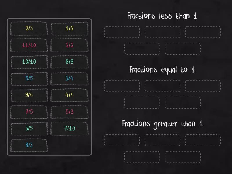Fractions less than 1: 1/2, 2/3, 3/4, 3/5, 7/10, Fractions equal to 1: 4/4, 5/5, 2/2, 8/8, 10/10, Fractions greater than 1: 7/5, 5/3, 9/4, 11/10, 8/3,