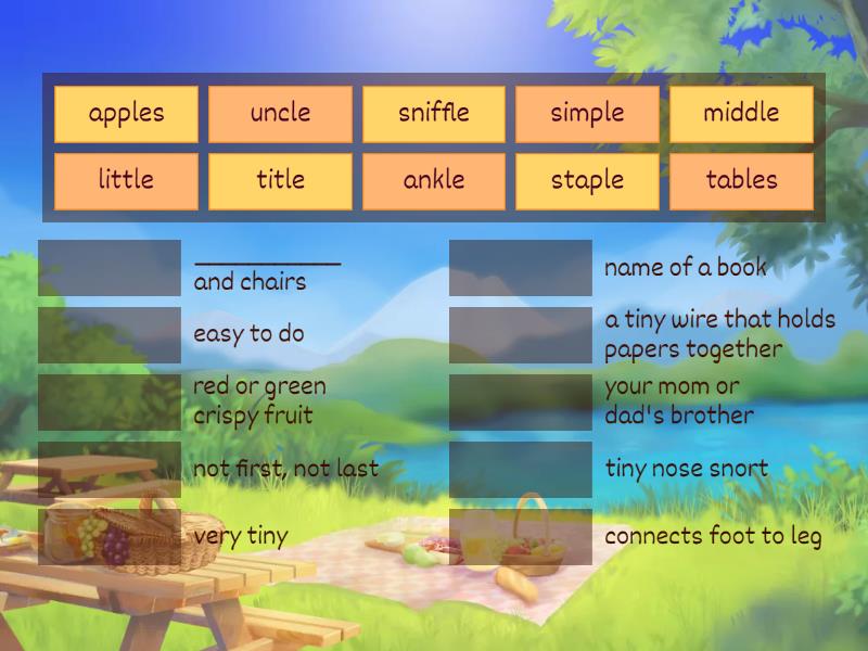 simple - easy to do, little - very tiny, middle - not first, not last, title - name of a book, ankle - connects foot to leg, sniffle - tiny nose snort, uncle - your mom or dad's brother, apples - red or green crispy fruit, tables - ___________ and chairs, staple - a tiny wire that holds papers together,