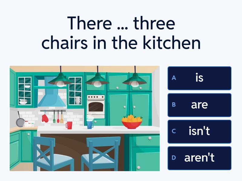 1) There ... a bed in the bedroom a) is b) are c) isn't d) aren't 2) There ... a table in the hall a) is b) are c) isn't d) aren't 3) There ... two children in the bath a) is b) are c) isn't d) aren't 4) There ... three chairs in the kitchen a) is b) are c) isn't d) aren't 5) There ... two armchairs in the living room a) is b) are  c) isn't  d) aren't 6) There ... a car in the garage a) is b) are c) isn't d) aren't 7) There ... two windows in the living room a) is b) are c) isn't d) aren't 8) There ... five bathes in the bathroom a) is b) are c) isn't d) aren't 9) There ... a cupboard in the kitchen a) is b) are c) isn't d) aren't 10) There ... a fridge in the kitchen a) is b) are c) isn't d) aren't 11) There ... a purple house a) is b) are c) isn't d) aren't 12) There ... a house in the water a) is b) are c) isn't d) aren't