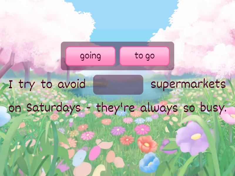 I try to avoid ____ supermarkets on Saturdays - they're always so busy. He hates ____ by plane. They decided ____ abroad and make a fresh start. It wasn't me who offered ____, it was Charlotte. Do you fancy ____ for a meal after work? He failed ____ on time. I want to travel because I enjoy ____ people and seeing new places. Once I start ____ chocolate, I can't stop. He risked ____ his house when his company went bankrupt. For the past month he's been spending all his energy ____ to find a job.