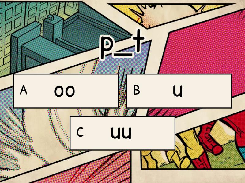1) p_t a) oo b) u c) uu 2) ho_ a) w b) e 3) bot_ a) e b) t c) h 4) w_lk a) o b) a c) u 5) on_e a) e b) s c) c 6) n_ne a) o b) u c) oo 7) t_o = 2 a) o b) w c) e 8) p_ll a) u b) o 9) no_ a) o b) oo c) w 10) _now a) n b) k 11) the_r = belongs to them a) e b) a c) i 12) h_r a) e b) a c) i 13) the_e a) z b) s c) ss 14) c_me a) u b) oo c) o