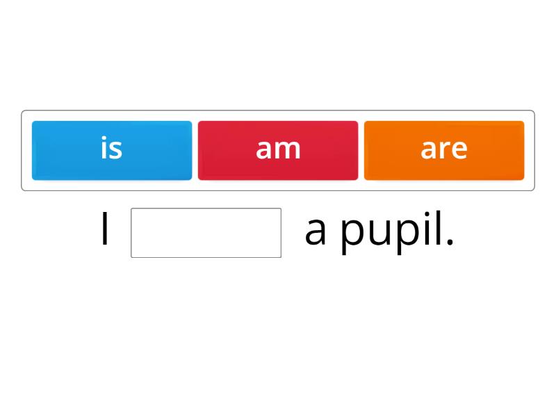 I ____ a pupil. The ruler____ white. The cats ____ grey. My hair____ brown. The book ____ good. We ____ friends. The pirates ____ bad. They ____friends. The girl ____ ten. The parrots ____ white and green. I ____ eight. The fish ____ big.