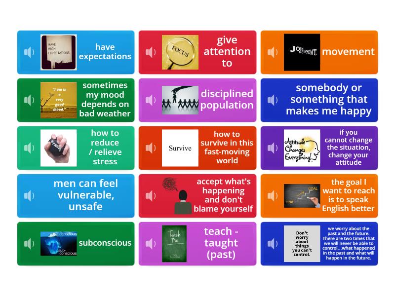 the goal I want to reach is to speak English better, how to reduce / relieve stress, men can feel vulnerable, unsafe, somebody or something that makes me happy, movement, how to survive in this fast-moving world, sometimes my mood depends on bad weather, have expectations, we worry about the past and the future. There are two times that we will never be able to control…what happened in the past and what will happen in the future., disciplined population, teach - taught (past), subconscious, give attention to , accept what's happening and don't blame yourself, if you cannot change the situation, change your attitude,