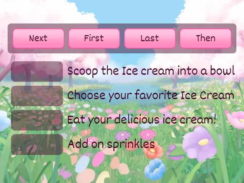 First - Choose your favorite Ice Cream, Next - Scoop the Ice cream into a bowl, Then - Add on sprinkles, Last - Eat your delicious ice cream!,