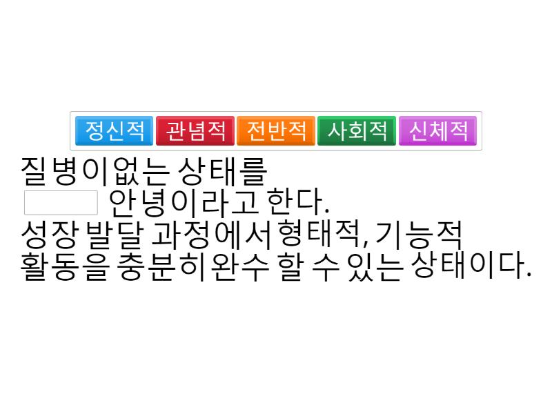 질병이 없는 상태를 ____ 안녕이라고 한다. 성장 발달 과정에서 형태적, 기능적 활동을 충분히 완수 할 수 있는 상태이다. 사회적 규범을 따르지 못하고 타인의 안전을 무시하고 무책임하며 직업적으로 책임을 다하지 못하는 정신질환을 반사회적 인격장애라고 하며 이를 청소년 시기에 발병하면 ____라고 진단한다. 라론드 보고서에서 건강에 영향을 미치는 주요 요인으로 가장 크게 작용하는 1순위는 ____이다. 오랫동안 음식을 짜게 먹으면 ____이나 각종 질환에 걸릴 위험이 높아진다. 보건 선생님의 성함은 ____이다. 개인이 속한 사회나 직장에 의해 질병을 일으킬 수 있으며 공기오염, 수질오염, 식품오염, 직장 내 유해한 작업환경이 영향을 준다. 이를 ____ 요인이라고 한다. 결핵 검사 주기는 ____ 실시한다.