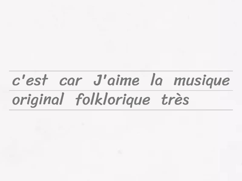 J'aime la musique folklorique car c'est très original, Je n'aime pas le classique car c'est ennuyeux, Je déteste la pop mais c'est entraînant, J'adore le rock car c'est rapide et vif, A mon avis le jazz est moderne, Je pense que le rap est trop fort, J'aime le rock et je voudrais jouer de la guitare, Mon chanteur préféré est Harry Styles., Sa musique me donne envie de chanter et danser., La musique de mes parents est nulle et démodée,