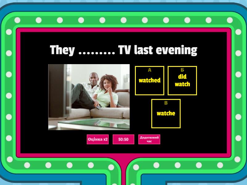 1) They ......... TV last evening a) watched b) did watch c) watche 2) The children .............. in the garden a) playd b) played c) plaied 3) The bus ........... in the bus stop a) stoped b) stopped c) did stop 4) The boy ............ for the test a) didn't study b) didn't studied c) studyed 5) .......... you ................ yesterday? a) Did / worked b) Did / work 6) We ............ our house last weekend a) clean b) cleanned c) cleaned 7) He....... flowers for his mother. a) buy b) bought c) buyed 8) Children ..... a snowman last Saturday a) maked b) make c) made 9) She ...... fishing and ...... a big fish yesterday! a) went....caught b) go..... catch c) caught....went 10) He ..... the dishes after dinner and .... tea a) wash b) washed.... made c) washid 11) We... to the beach and ....... at the stars last night and  a) go...look b) goed....looked c) went..... looked 12) Mary.....a lot of photos when she ..... to the park a) took....went b) taked....goed c) take........go