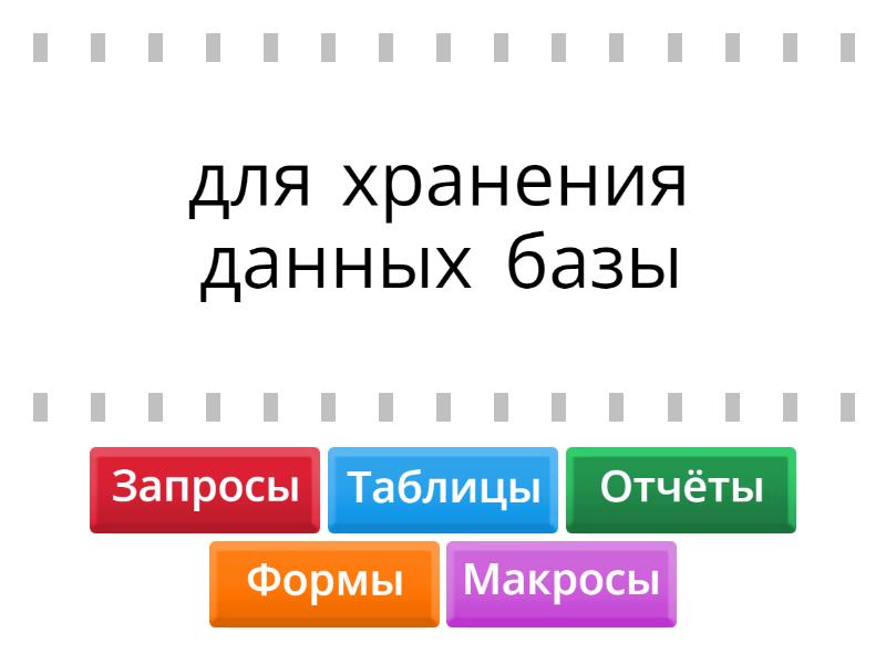 Таблицы - для хранения данных базы, Запросы - для отбора и обработки данных базы, Формы - для ввода данных базы и их просмотра, Отчёты - для вывода обработанных данных базы на принтер, Макросы - для автоматического выполнения группы команд,