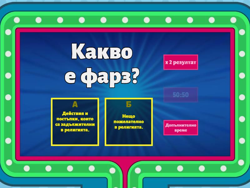 1) Какво е фарз? a) Действия и постъпки, които са задължителни в религията. b) Нещо пожелателно в религията. 2) Кое от посочените е фарз? a) Зекят b) Коленето на курбан 3) Колко вида фарз има? a) Фарз-мустехаб и Фарз-сюннет b) Фарз-и айн и Фарз-и кифайе 4) Какво представлява фарз-и айн? a) Задължение, което всеки сам трябва да извърши. b) Задължение, което няма проблем да не извършиш. 5) Какво е фарз-и кифайе? a) Задължение, което всеки сам трябва да извърши. b) Задължение, което ако един мюсюлманин извърши, отговорността отпада от останалите. 6) Кое от изброените е фарз-и айн? a) Намаз b) Да отидеш на погребение 7) Кое от изброените е фарз-и кифайе? a) Оруч b) Да кланяш дженазе намаз 8) Отричането на фарз води до: a) излизане от религията b) награда (севаб) 9) Не изпълняването на фарз води до: a) излизане от религията b) грях 10) Изпълняването на фарз води до: a) награда (севаб) b) грях 11) Какво е ваджиб? a) Действие, което е заповядано да се извърши, без категорично доказателство. b) Действие, което е забранено. 12) Кое от посочените е ваджиб? a) Хадж b) Байрям намаз 13) Отричането на ваджиб води до: a) излизане от религията b) грях 14) Изпълняването на ваджиб води до: a) награда (севаб) b) излизане от религията 15) Какво е сюннет? a) Забранени действия в исляма. b) Действия, които Мухаммед (с.а.с) е правил и одобрявал. 16) Какво е сюннет-и мюеккеде? a) Действия, които Мухаммед (с.а.с) много рядко пропускал. b) Действия, които Мухаммед (с.а.с) категорично е забранил. 17) Какво е сюннет-и гайр-и мюеккеде? a) Действия, които Мухаммед (с.а.с.) е изпълнявал рядко. b) Действия, които Мухаммед (с.а.с) категорично е забранил. 18) Не изпълнението на сюннет води до: a) грях b) пропускане на награда (севаб) 19) Кое от посочените е сюннет? a) Два рекята намаз на сабах, преди фарза. b) Два рекята намаз, когато си пожелаеш. 20) Какво е мустехаб? a) Нежелателни постъпки. b) Добри постъпки, които нямат задължителен характер. 21) Кое от посочените е мустехаб? a) Подаряване на подарък b) Пушене на цигари