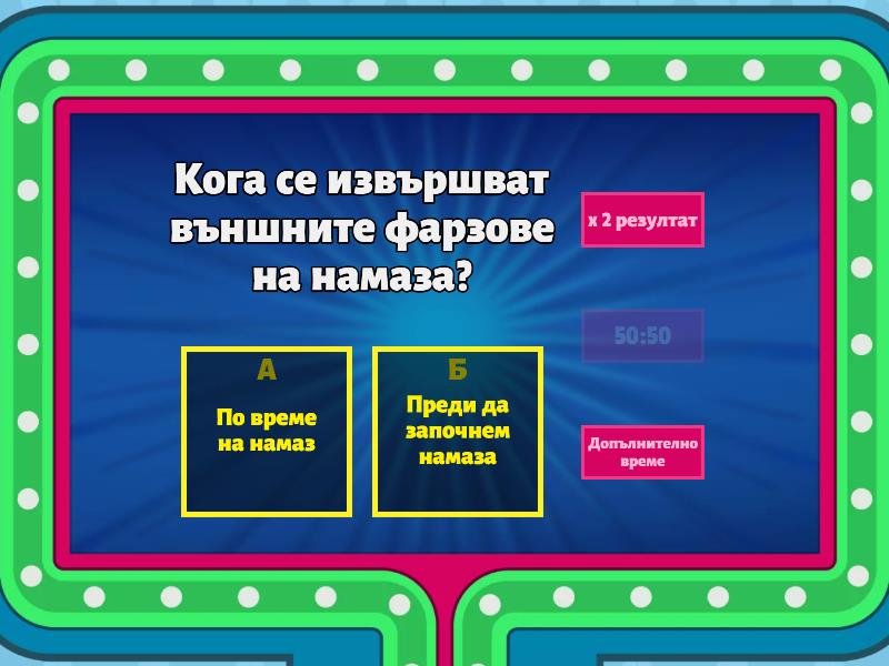 1) Кога се извършват външните фарзове на намаза? a) По време на намаз b) Преди да започнем намаза 2) Колко на брой са външните фарзове на намаза? a) Шест b) Девет 3) Кой е първият външен фарз на намаза? a) Да вземем абдест b) Да се наспим 4) Кой е вторият външен фарз на намаза? a) Да се нахраним. b) Да почисти тялото, дрехите и мястото за намаз. 5) Кой е третият външен фарз на намаза? a) Да се облечем подходящо за намаз b) Да направим селеват 6) Кои части от тялото на мъжете трябва да бъдат покрити по време на намаз? a) От корема до коленете b) От шията до глезените 7) Кой е четвъртият външен фарз на намаза? a) Да прочетем сура Фатиха b) Да изчакаме точното време за намаз 8) Кои части от тялото на жените, трябва да бъдат покрити по време на намаз? a) От шията до глезените. b) Цялото тяло, освен лицето, ръцете до китките и краката до глезените. 9) Кой е петият външен фарз на намаза? a) Да се обърнем в посока на Къбле b) Да се обърнем в посока Юг 10) Кой е шестият външен фарз на намаза? a) Да направим нийет (намерение) b) Да направим дуа