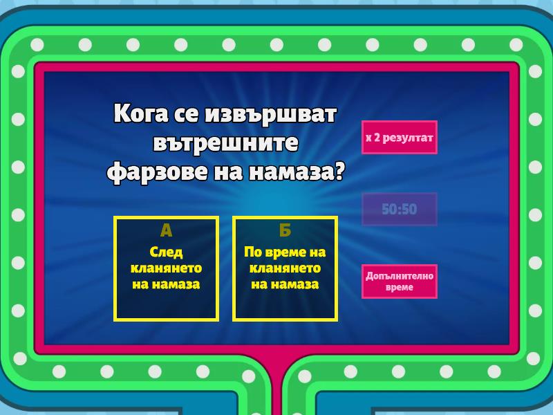 1) Кога се извършват вътрешните фарзове на намаза? a) След кланянето на намаза b) По време на кланянето на намаза 2) Колко на брой са вътрешните фарзове на намаза? a) 8 b) 6 3) Кой е първият вътрешен фарз на намаза? a) Встъпителен (ифтитах) текбир b) Слагане на намазлък 4) Кой е вторият вътрешен фарз на намаза? a) Стоене прав (къям) b) Приготвяне на теспих 5) Кой е третият вътрешен фарз на намаза? a) Слагане на шапка и забрадка b) Четене на Коран (къраат) 6) Кой е четвъртият вътрешен фарз на намаза? a) Рукю (навеждане в поклон) b) Дигане на ръцете за дуа 7) Кой е петият вътрешен фарз на намаза? a) Седжде (навеждане в поклон до земята) b) Правене на дуа 8) Кой е шестият вътрешен фарз на намаза? a) Даване на селям b) Сядане на последния рекят