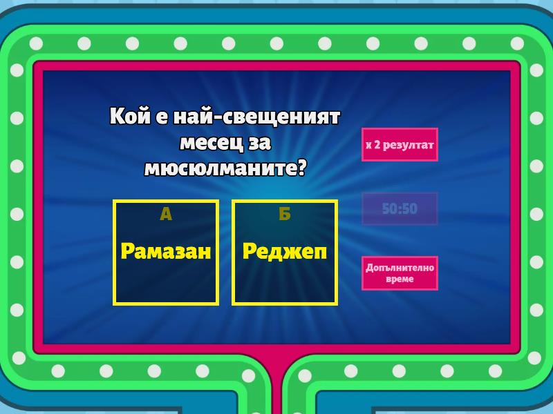 1) Кой е най-свещеният месец за мюсюлманите? a) Рамазан b) Реджеп 2) Въздържането от ядене, пиене и полова връзка от имсак до ифтар се нарича: a) оруч b) хадж 3) Какво е имсак? a) Времето до изгрев слънце b) Времето след залез слънце 4) Как се нарича времето след залез слънце, в което хората разговяват? a) Ифтар b) Сухур 5) Как се нарича закуската, преди изгрев слънце, по време на месец Рамазан? a) Ифтар b) Сухур 6) Оручът е задължение за: a) абсолютно всички хора b) за мюсюлманите 7) За кои мюсюлмани е фарз оручът? a) Абсолютно всички b) Физически и психически здравите 8) Кога оручът става фарз за един мюсюлманин? a) Когато достигне полова зрялост b) От както се роди