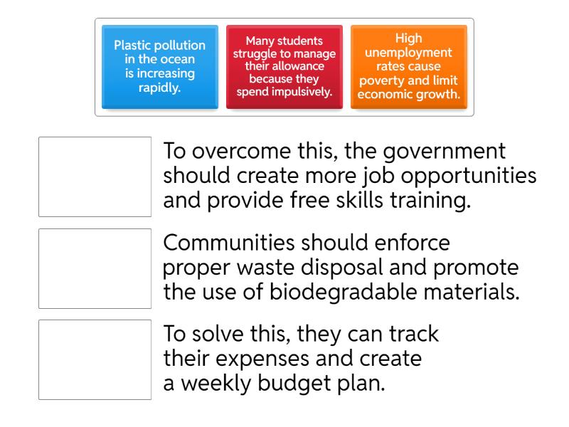 Many students struggle to manage their allowance because they spend impulsively. - To solve this, they can track their expenses and create a weekly budget plan., High unemployment rates cause poverty and limit economic growth. - To overcome this, the government should create more job opportunities and provide free skills training., Plastic pollution in the ocean is increasing rapidly. - Communities should enforce proper waste disposal and promote the use of biodegradable materials.,