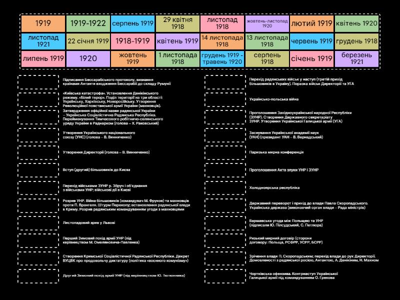 29 квітня 1918 - Державний переворот і прихід до влади Павла Скоропадського. Українська держава (виконавчий орган влади – Рада міністрів), серпень 1918 - Утворення Українського національного союзу (УНС) (голова – В. Винниченко), 1 листопада 1918 - Листопадовий зрив у Львові, 13 листопада 1918 - Проголошення Західноукраїнської народної Республіки (ЗУНР). Створення Державного секретаріату ЗУНР. Утворення Української Галицької армії (УГА), 1918-1919 - Українсько-польська війна, 14 листопада 1918 - Утворення Директорії (голова – В. Винниченко), листопад 1918 - Заснування Української академії наук (УАН) (президент УАН – В. Вернадський), грудень 1918 - Зрічення влади П. Скоропадським; перехід влади до рук Директорії. Домовленості з радянської росією, Антантою, А. Денікіним, Н. Махном, 22 січня 1919 - Проголошення Акта злуки УНР і ЗУНР, 1919-1922 - Холодноярська республіка, лютий 1919 - Вступ (другий) більшовиків до Києва, січень 1919 - Затвердження офіційної назви радянської України – Українська Соціалістична Радянська Республіка. Перейменування Тимчасового робітничо-селянського уряду України в Раднарком (голова – Х. Раковський), 1919 - Паризька мирна конференція, квітень 1919 - Створення Кримської Соціалістичної Радянської Республіки. Декрет ВУЦВК про продовольчу диктатуру (політика «воєнного комунізму»), червень 1919 - Чортківська офензива. Контрнаступ Української Галицької армії під командуванням О. Грекова, липень 1919 - Перехід військами ЗУНР р. Збруч і об’єднання з військами УНР; військові дії в Києві, серпень 1919 - «Київська катастрофа». Установлення Денікінського режиму. «Білий терор». Поділ території на три області: Українську, Харківську, Новоросійську. Утворення Революційної повстанської армії України (махновців)., жовтень 1919 - Перехід радянських військ у наступ (третій прихід більшовиків в Україну). Поразка військ Директорії та УГА, грудень 1919 - травень 1920 - Перший Зимовий похід армії УНР (під керівництвом М. Омеляновича-Павленка), квітень 1920 - Варшавська угода між Польщею та УНР (підписали Ю. Пілсудський, С. Петлюра), 1920 - Підписання Бессарабського протоколу, визнання країнами Антанти входження Бессарабії до складу Румунії, жовтень-листопад 1920 - Розрив УНР. Війна більшовиків (командувач М. Фрунзе) та махновців проти П. Врангеля. Штурм Перекопу; встановлення радянської влади в Криму. Розрив радянським командуванням угоди з махновцями, березень 1921 - Ризький мирний договір (сторони договору: Польща, РСФРР, УСРР, БСРР), листопад 1921 - Другий Зимовий похід армії УНР (під керівництвом Ю. Тютюнника),