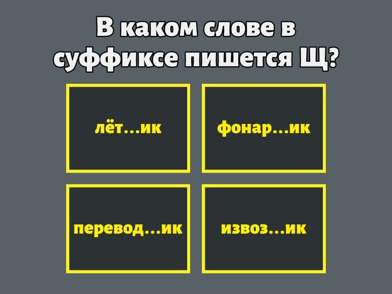 1) В каком слове в суффиксе пишется Щ? a) лёт...ик b) фонар...ик c) перевод...ик d) извоз...ик 2) В каком слове в суффиксе пишется Ч? a) прокат...ик b) бан...ик c) процент...ик d) кровель...ик 3) В каком слове в суффиксе пишется Ч? a) телевизион...ик b) объезд...ик c) флейт...ик d) барабан...ик 4) В каком слове в суффиксе пишется Щ? a) груз...ик b) сбор...ик c) аппарат...ик d) разнос...ик 5) В каком слове в суффиксе пишется Ч? a) алимент...ик b) гон...ик c) развед...ик d) шарман...ик 6) В каком слове в суффиксе пишется Ч? a) гарпун...ик b) камен...ик c) оцен...ик d) буфет...ик
